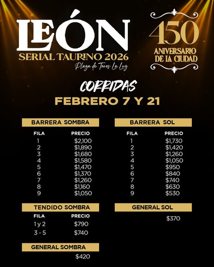 “FERIA TAURINA DE LEÓN 2026”, del 24 de enero al 23 de mayo, donde se encuentra encuadrada también la gran “CORRIDADE LA VIRGEN DE LA LUZ”, las cuales se llevarán a cabo en la Plaza de Toros “La Luz”.