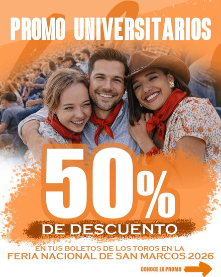 A partir del 27 de Marzo obtén un 50% de descuento en los boletos para las corridas del Serial Taurino 2026, mostrando tu credencial universitaria vigente en taquillas de la plaza, misma que también deberá de presentarse el día de la corrida en el acceso. Exclusivo para localidades de Tendido Sol.