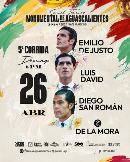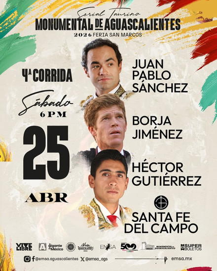 PLAZA MONUMENTAL AGUASCALIENTES La empresa EMSA se complace en anunciar los carteles de la Feria de San Marcos 2026 en la Plaza de Toros Monumental de Aguascalientes. La cartelera se compone de un total de 11 festejos taurinos, del 18 de abril al 10 de mayo, los cuales estarán enmarcados dentro de la verbena de la Feria Nacional de San Marcos 2026, en su edición 197.